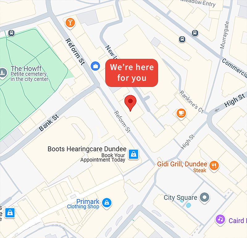 We’re right here, in the heart of Dundee city, just a five minute walk from the bus station or train station and we’re even less from all the main city bus routes. We’re in the city centre, close to the Overgate and Wellgate shopping centres.