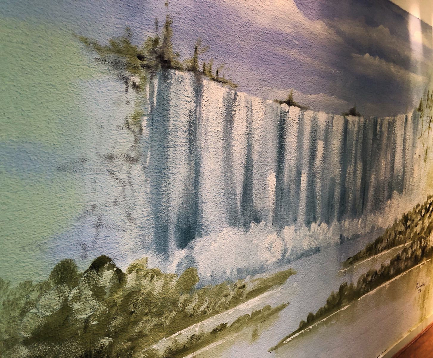 Our downstairs corridor waterfall mural was painted by by Glasgow artist Roderick Abercrombie Smith, a long time friend and contributor. Enjoy!